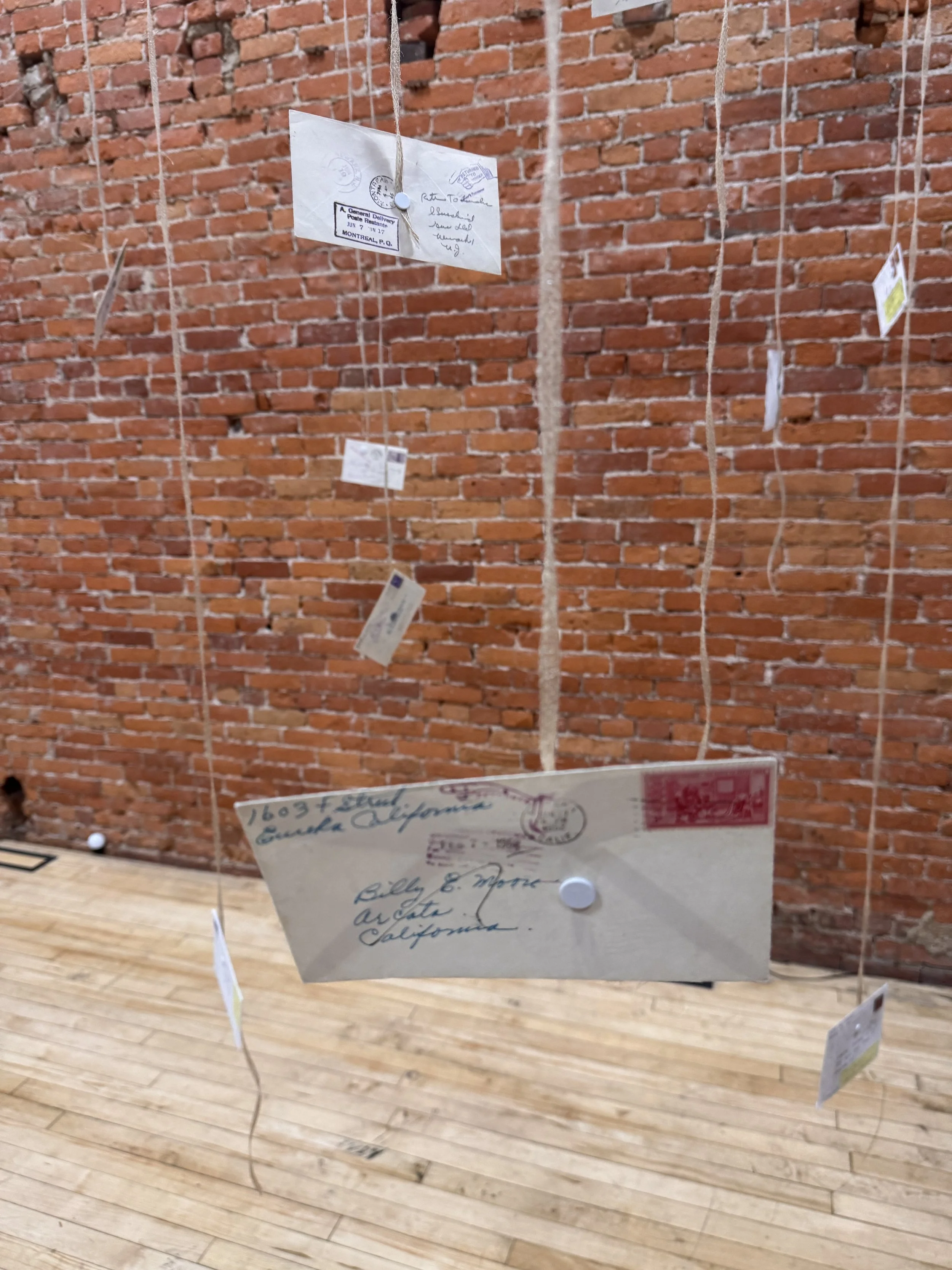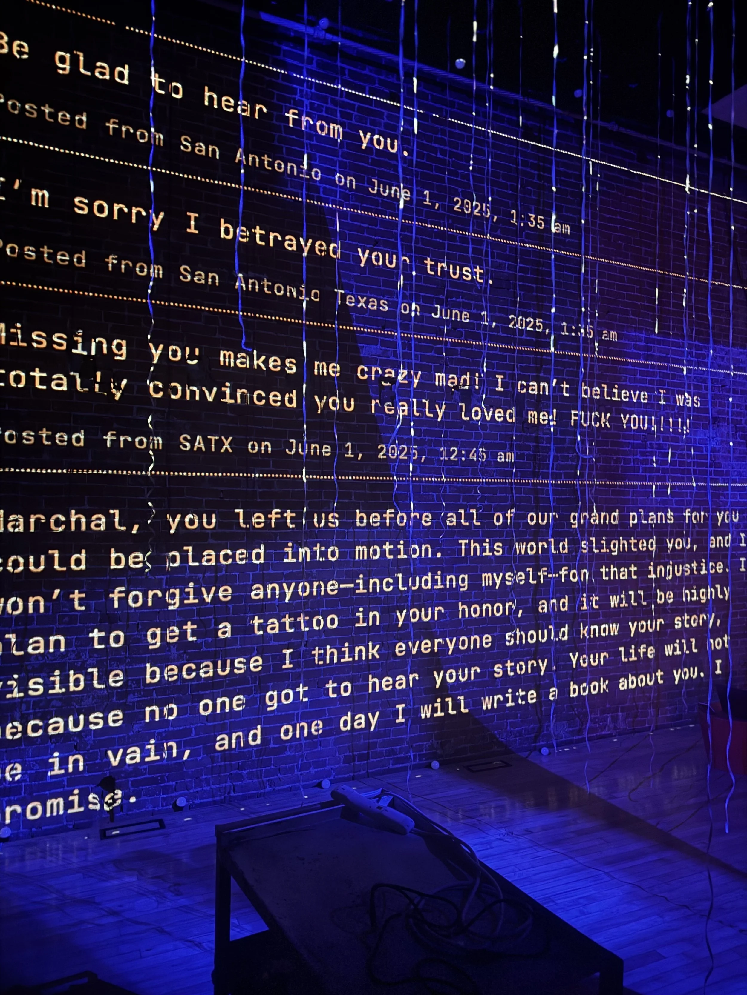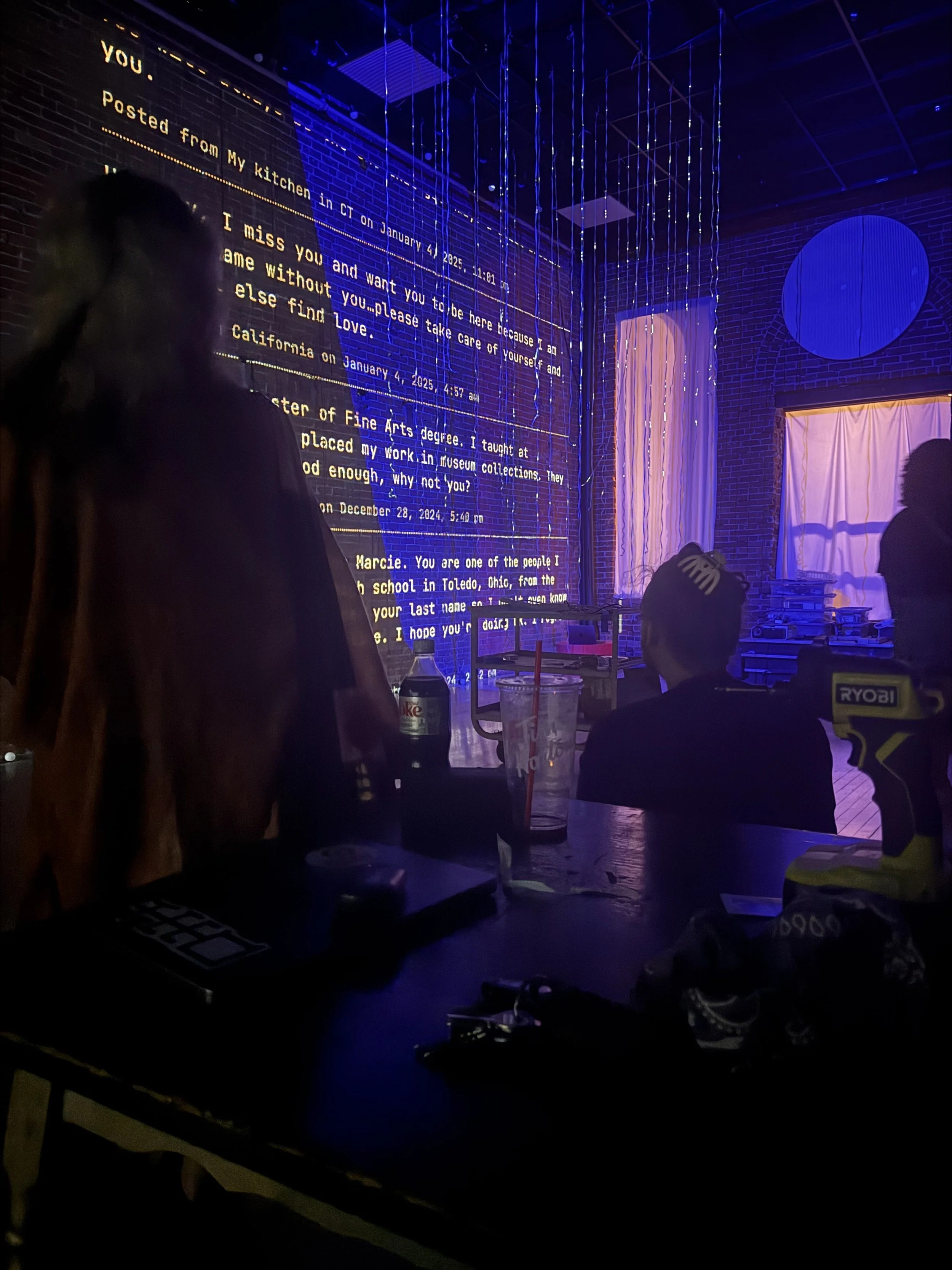 Texts, emails, voicemails, social chats, and other digital messages inundate me daily, blurring the line between “in real life” (IRL) and virtual connections. Technologies proclaiming to connect frequently leave me feeling isolated and overwhelmed. This installation blends recorded and live communications by projecting fragments of unanswered digital communications over physical “return to sender” letters and mixing voice recordings with live feedback. My work underscores the unfulfilled longing for intimacy that digital culture amplifies. I aim to create spaces where viewers can reflect on the quality of their communications and consider intentional, authentic ways to connect in an increasingly mixed reality world.